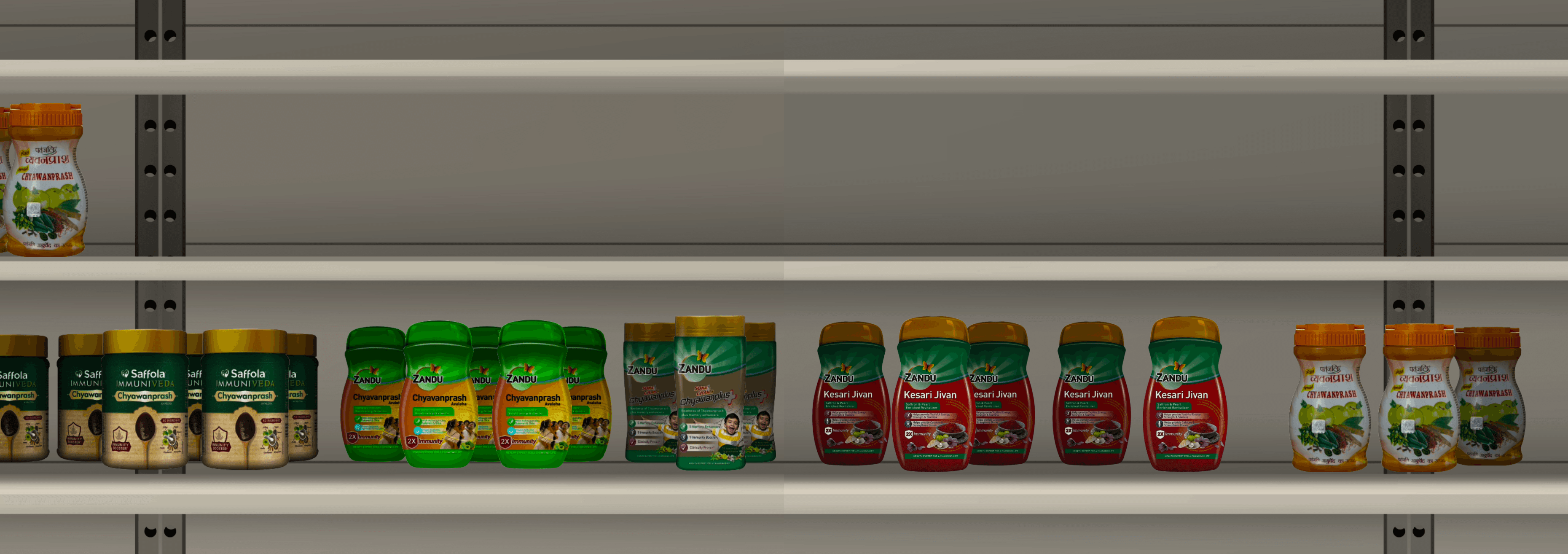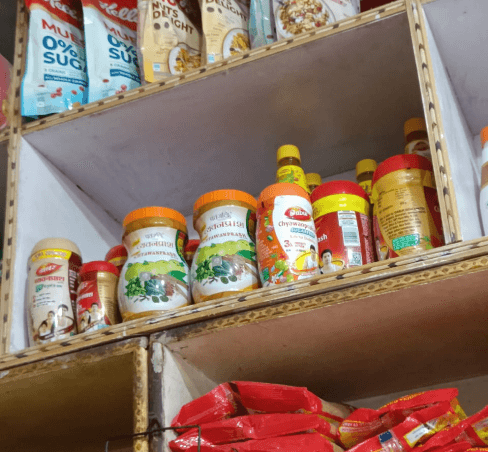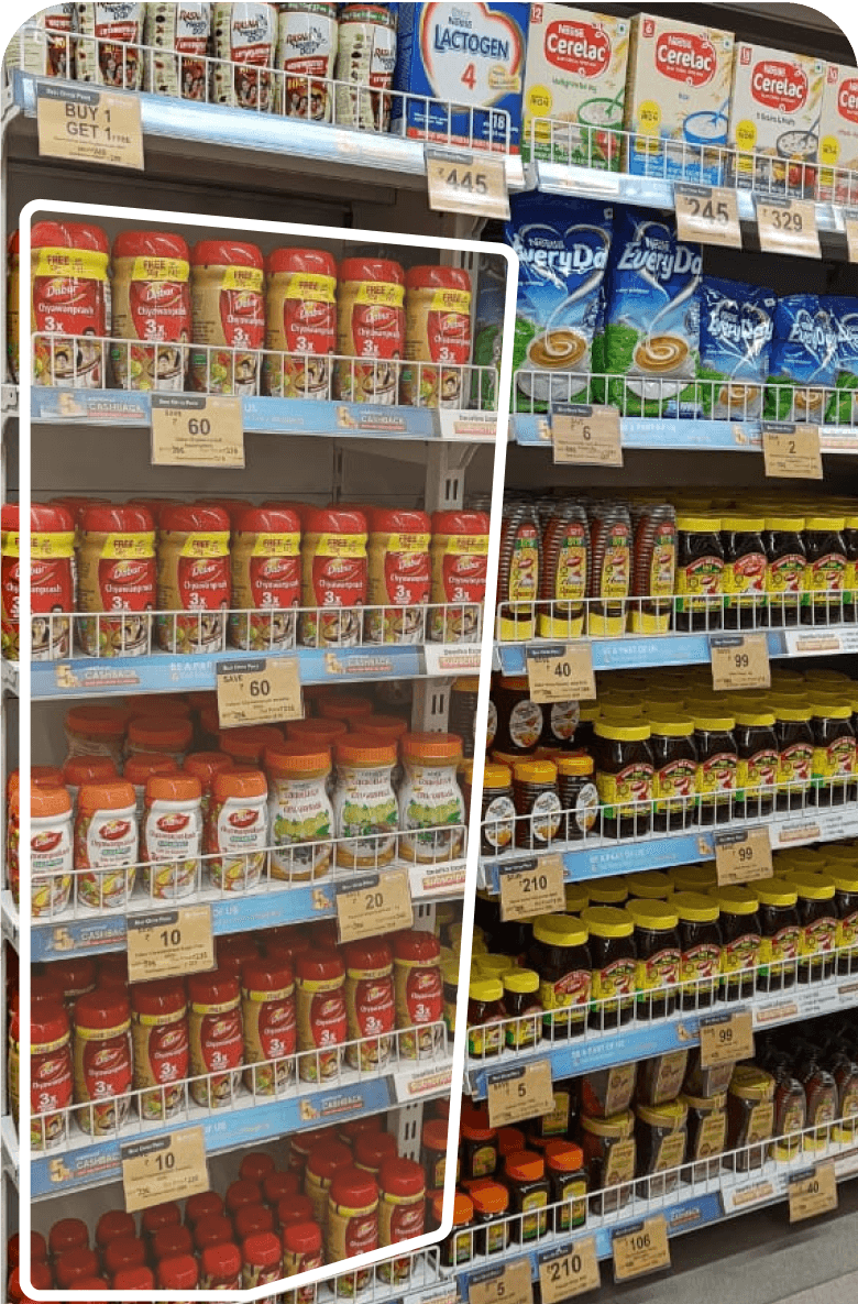 It's mostly stored in the upper shelves, while everyday essentials are placed on eye-level shelves for increased sales, given their necessity. Chyawanprash is considered more of a preference than a necessity by people.